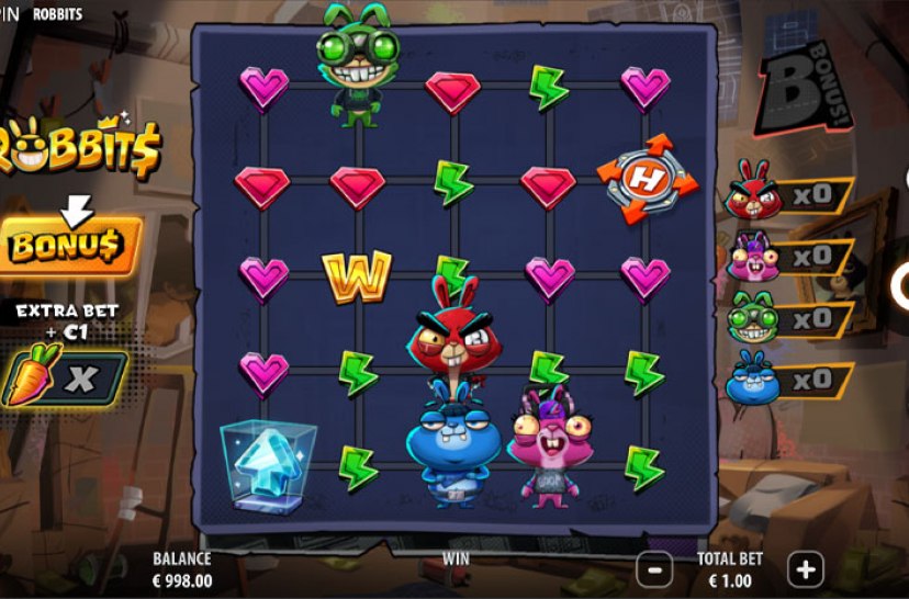 Liity mukaan uhkarohkeaan ryöstöretkeen pelissä Robbits, pelintarjoajan Quickspin uusimmassa pelissä, jossa pelaa peloton robottikanien miehistö. Tämä Cluster-Collect-kolikkopeli alkaa 5×5-ruudukolla ja voi laajentua jopa 8×8-ruudukoksi. Romahtavalla mekaniikalla, porkkanatehosteiden, laajenevien rullien ja päivitettävien symbolien ansiosta jokainen liike ruokkii nerokasta ja energistä ryöstöä.