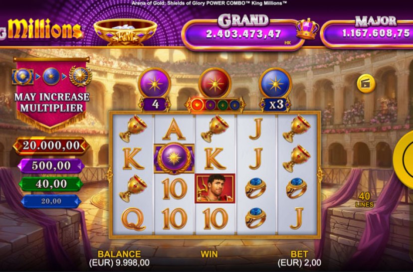 Astu jylisevään Colosseumiin Arena of Gold: Shields of Glory POWER COMBO™ King Millions™ -pelissä, jossa gladiaattorit taistelevat onnesta ja kunniasta. King Millions™ -progressiivisen järjestelmän ja dynaamisten Power Combo™ -ominaisuuksien ansiosta jokainen pyöräytys tarjoaa eeppistä toimintaa ja mahdollisuuden voittaa elämää mullistavia useiden miljoonien jättipotteja.