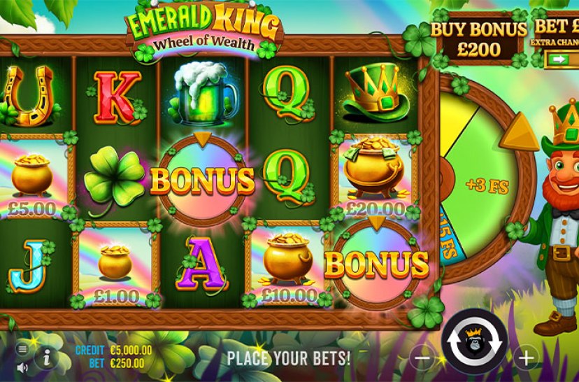 Tavoittele onnea sateenkaaren päässä Emerald King – Wheel of Wealth -pelissä, joka on 5×3-kokoinen Emerald Isle -kolikkopeli. Apilanlehdet ja tuopit reunustavat rullia, kun 3–5 bonussymbolia käynnistävät 10–20 ilmaiskierrosta. Kaksi bonussymbolia voi myös pyörittää Wheel of Wealth -pyörää, joka myöntää jopa 20 ylimääräistä ilmaiskierrosta.