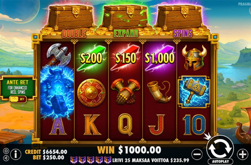 Unleash Viking power in Hammerstorm, where red, green and purple lightning is collected by the Double, Expand or Spins chests above the reels. Any gem may randomly trigger 5 Respins, adding bursts of energy and unpredictable wins. A vibrant Nordic-style slot filled with storm-charged features and bonus potential.