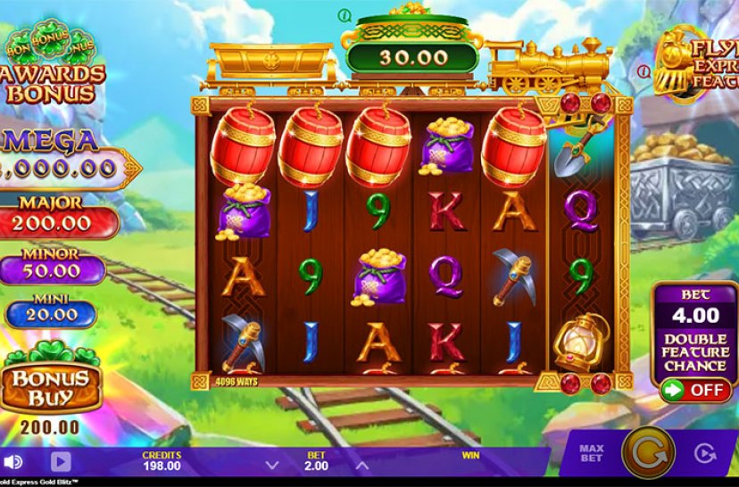Liity Lucky Lad Flynnin seuraan Mining Pots of Gold Express Gold Blitz™ -pelissä, joka on nopeatempoinen seikkailu täynnä ominaisuuksia. 4096 eri voittotapaa, pinottuja symboleja, suoraa käteisnostoa ja useita ilmaiskierrosbonuksia takaavat jännityksen joka pyöräytyksessä. Express-ominaisuus tarjoaa räjähtäviä palkintoja ja jättipotteja jopa 2500x-kertaisesti panoksesi arvosta.